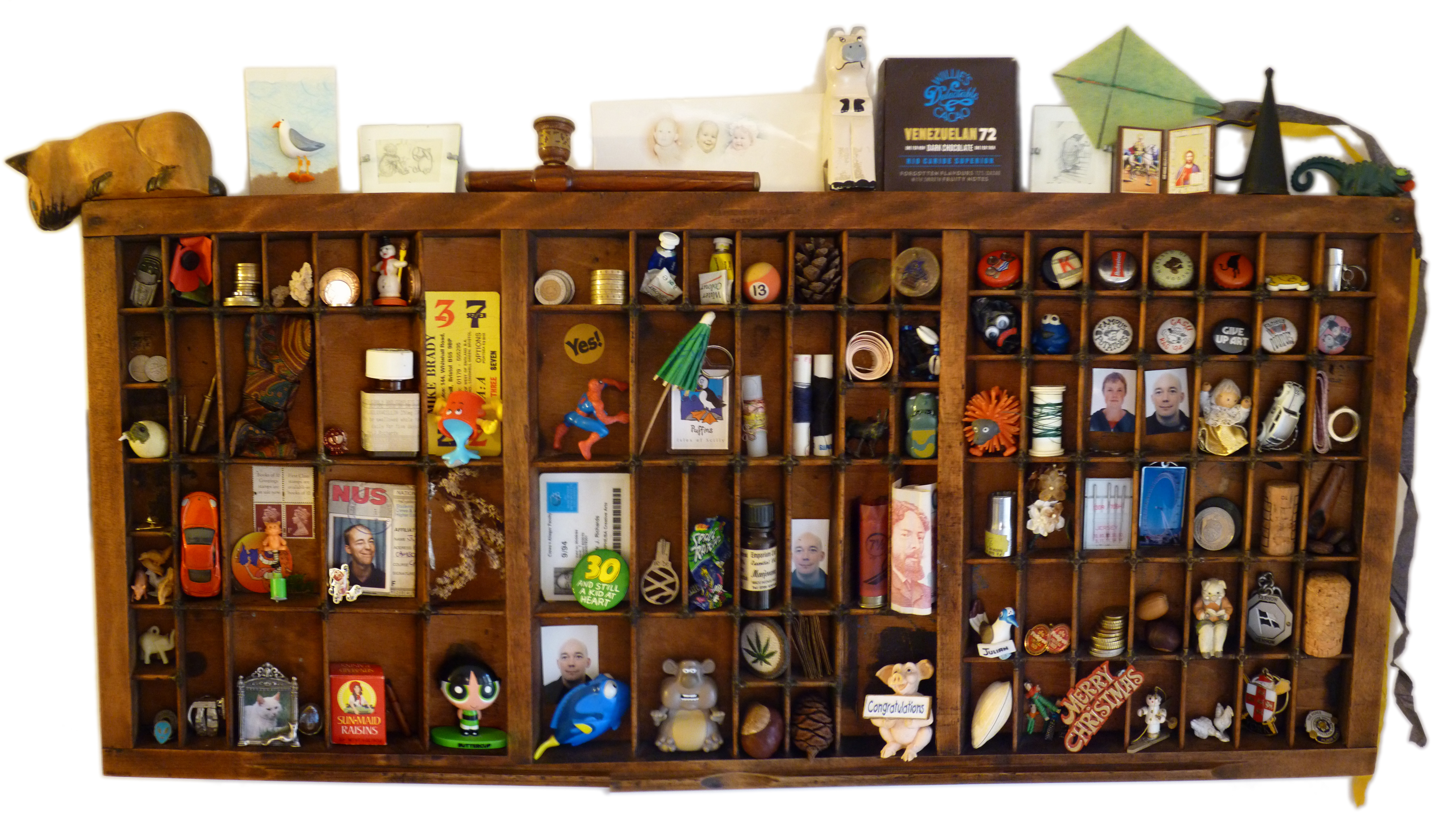 The case has all sorts of stuff in it – from Ecuadorian Sucre, cocao beans, bottle tops and pigs to a shrunken Space Raider packet. – I was gonna label it all but can’t be bothered –that would be anal!