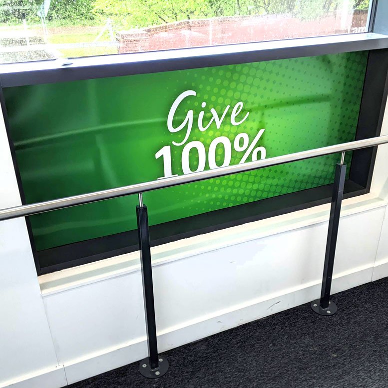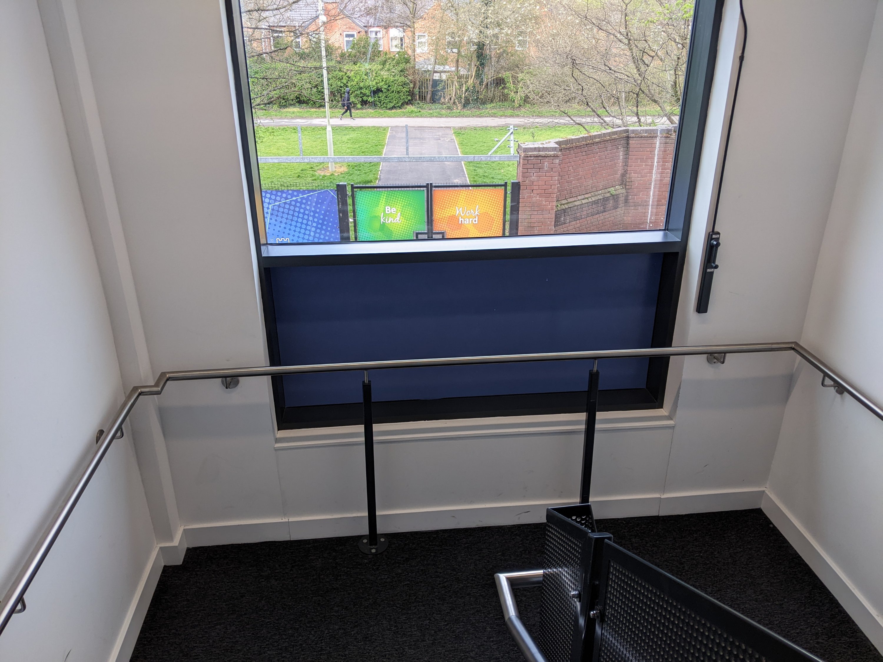 As the windows are conduits to outside, these graphics are similar to the signage installed on the scholars’ outside exercise spaces. The idea is that this mirrors the outside environment, making these empty stairwells more dynamic.