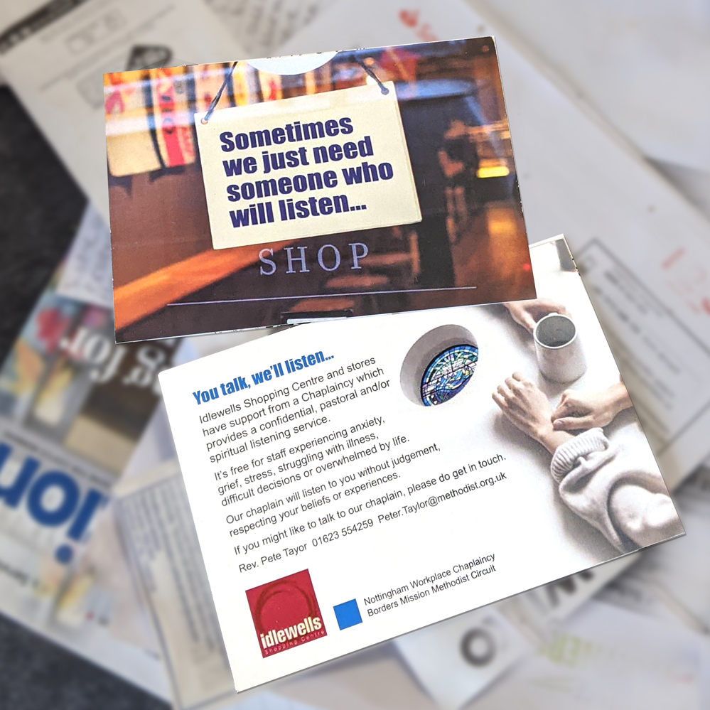 “You talk, we’ll listen…” says the chaplaincy which provides a confidential, pastoral listening service. The service is free for centre staff experiencing anxiety, grief, stress, struggling with illness, difficult decisions or overwhelmed by life. It’s someone who will listen without judgement…
