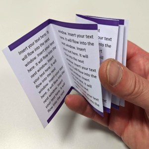 Duplicate a master, and create your different pages (or mail-merge your data/text into a master). With Publisher we can then print this on A4 as a set (multiple pages per sheet) or as a stack of sets (multiple copies per sheet). These can be easily electronically guillotined and banded.